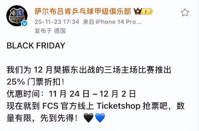 德甲萨尔布吕肯乒乓球俱乐部官方表示,樊振东将在12月出战三场主场比赛。这三场主场比赛分别是12月14日和21日的两场德甲,以及12月20日的欧冠。12 月 14 日:德甲联赛主场对决;12 月 20 日:欧冠赛事主场出战;12 月 21 日:德甲联赛主场再战。这些在中国从没有人关注的比赛,因为樊振东的参与,现在已经成为了关注的焦点,可以说樊振东开拓了中国人看德国人打乒乓球的先河。这在之前,中国人可能看的只有德国人踢足球。