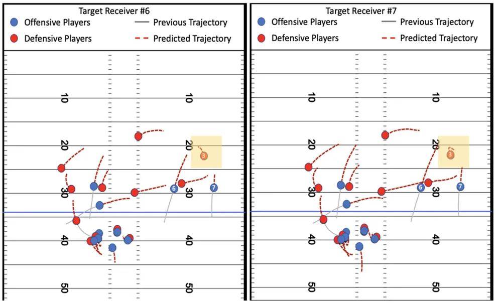 左图:当 6 号球员是(四分卫的)传球目标时,深度学习模型预测的 3 号防守后卫的移动轨迹;