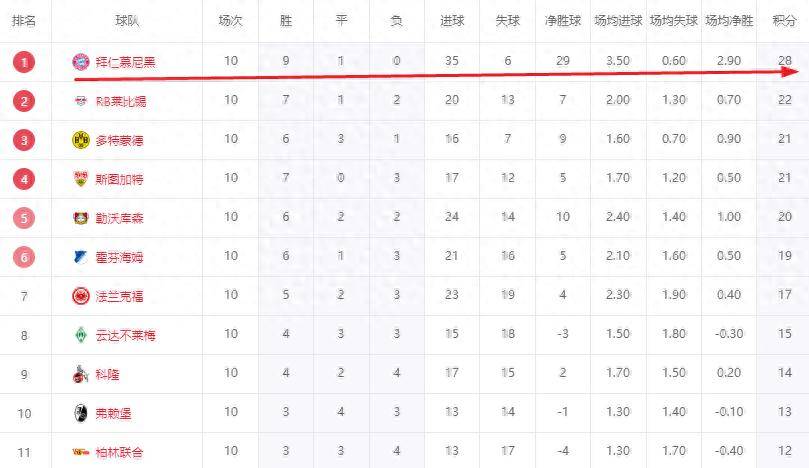 相比之下,还是德甲霸主拜仁最稳,尽管他们在最新一轮的德甲比赛中,2-2打平柏林联合,但是在德甲积分榜上,拜仁9胜1平,保持不败,积28分还是排在榜首,比第2名多了6分,比第3名多了7分,优势很大,而在欧冠方面他们也是4连胜排在第1,他们也成为了目前五大联赛的唯一不败球队。