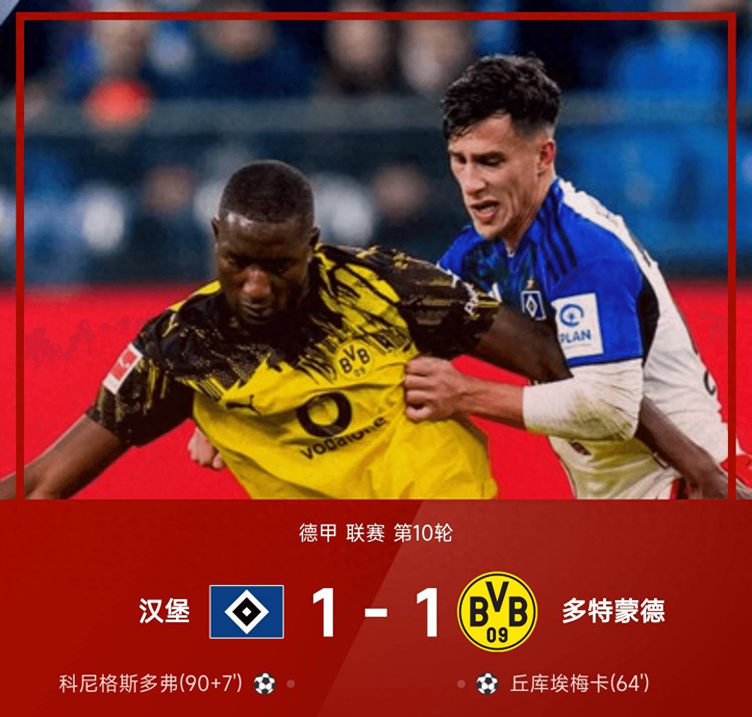 德甲直播,德甲赛程,德甲积分榜,拜仁vs多特直播,德甲比分预测/专为中文球迷打造的德甲资讯站,覆盖2025赛季直播入口、赛程安排、积分榜更新与竞彩比分预测,聚焦拜仁、多特、莱比锡、勒沃库森等焦点球队。11月09日25/26赛季德甲联赛第10轮,汉堡1-1战平多特蒙德。上半场比赛双方均无建树,下半场丘库埃梅卡抽射破门,科尼格斯多弗补时阶段头槌破门完成绝平。