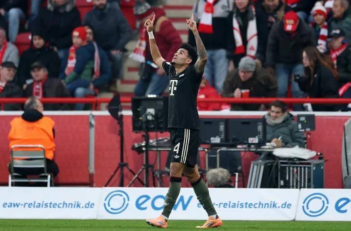 丢球后的拜仁加强进攻,第38分钟,迪亚斯与斯坦尼西奇在禁区内做二过一的撞墙式配合,斯坦尼西奇直传,迪亚斯前插在底线处滑铲停球后精彩过后,小角度爆射破门得分,拜仁扳平比分,1-1柏林联合。第45分钟,拜仁打出快攻,凯恩斜传,迪亚斯单刀杀入禁区内推射居然打偏,错失进球良机。上半场补时阶段,基米希传中,奥利塞攻门,于帕梅卡诺不停球挑传,凯恩空门得手,但被判越位在先,进球无效。