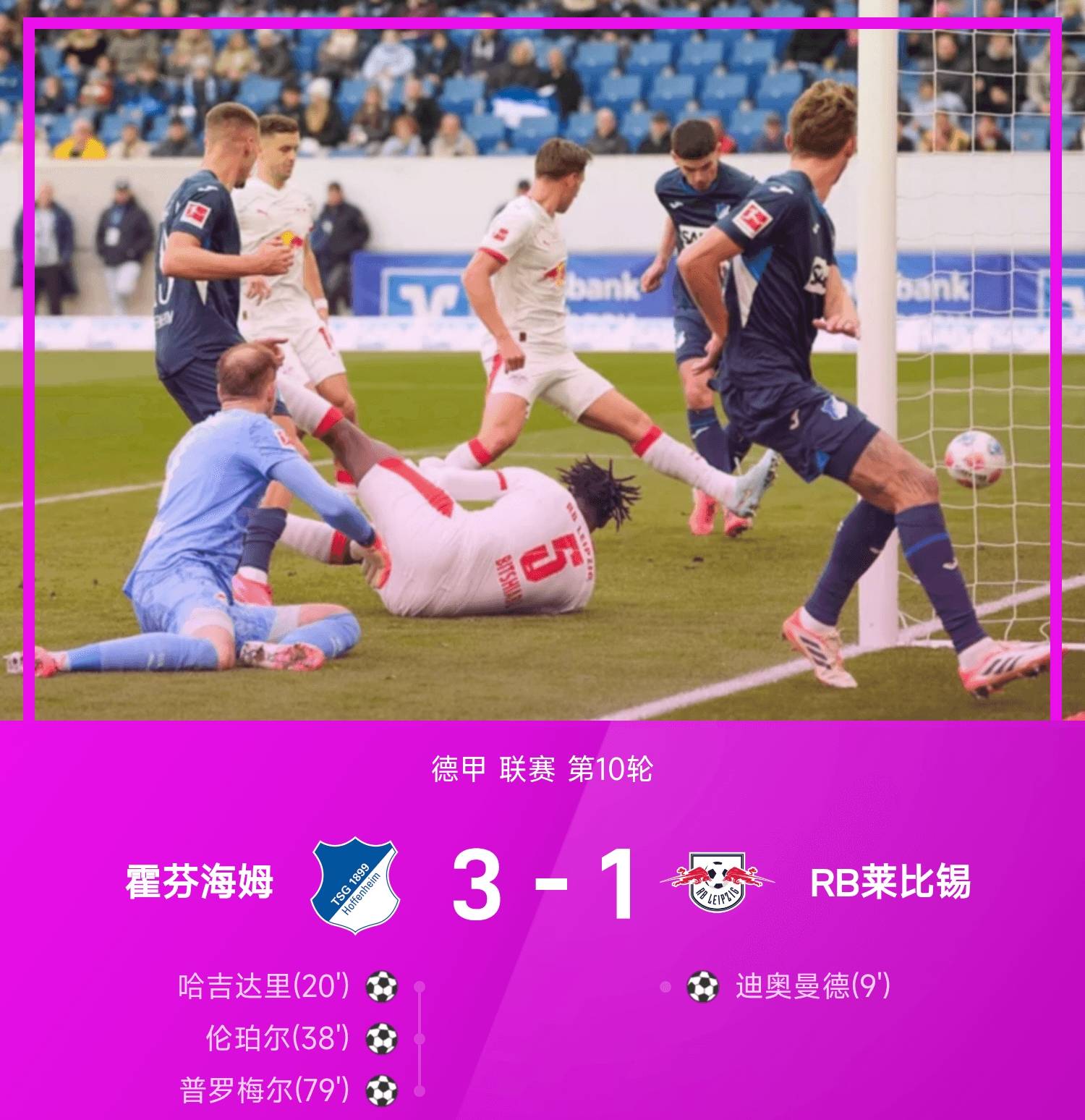 11月9日 25-26赛季德甲联赛第10轮,霍芬海姆主场迎战RB莱比锡。此役上半场,迪奥曼德突入禁区推射首开记录,哈吉达里推射空门扳平比分,伦珀尔头球建功。易边再战,普罗梅尔禁区中路迎球扫射破门。全场比赛结束,霍芬海姆3-1逆转RB莱比锡。