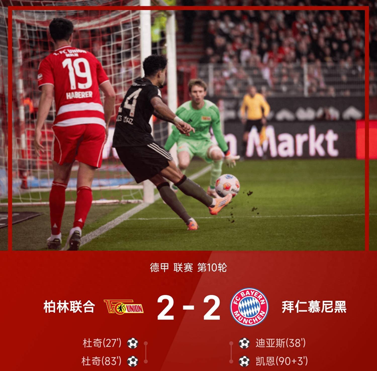 全场比赛:第27分钟,柏林联合右侧角球机会,球罚向禁区,多基抢点打门,诺伊尔扑救脱手,球滚进球门,柏林联合1-0拜仁。第38分钟,迪亚斯与斯坦尼西奇打出撞墙式配合,随后迪亚斯底线前将球救回,过掉防守球员后零度角射门打进,拜仁1-1柏林联合。第83分钟,柏林联合前场任意球机会,尤拉诺维奇将球送入禁区,凯恩头球解围变成乌龙助攻,多基将球打进,柏林联合2-1拜仁。第90 3分钟,拜仁左路策动进攻,比朔夫送出传中,凯恩禁区内头球攻门,容诺夫扑到但没能阻止此球入网,拜仁2-2柏林联合。