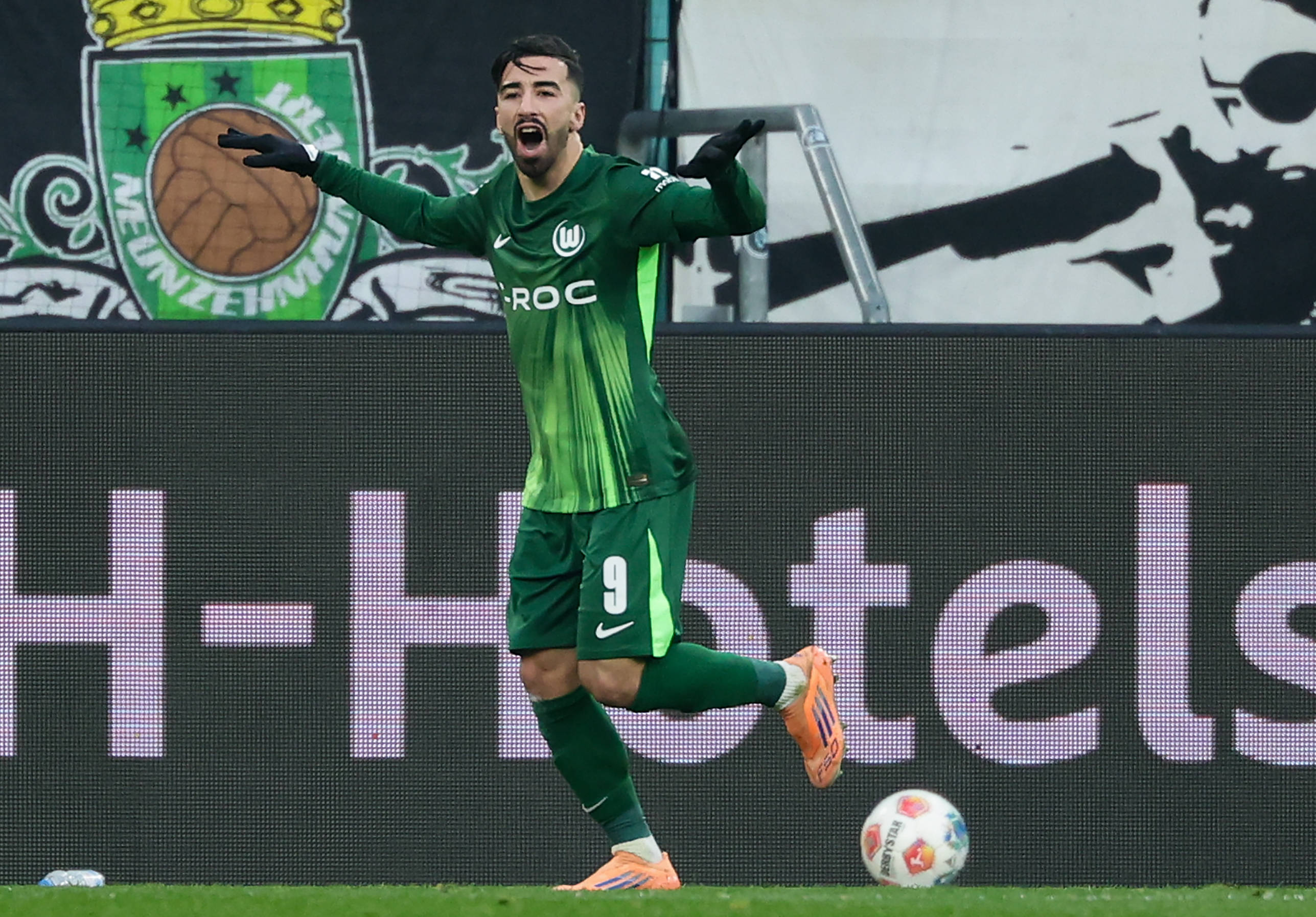 12月13日,沃尔夫斯堡队球员阿穆拉庆祝得分。 新华社发(约阿希姆·毕瓦勒兹摄)