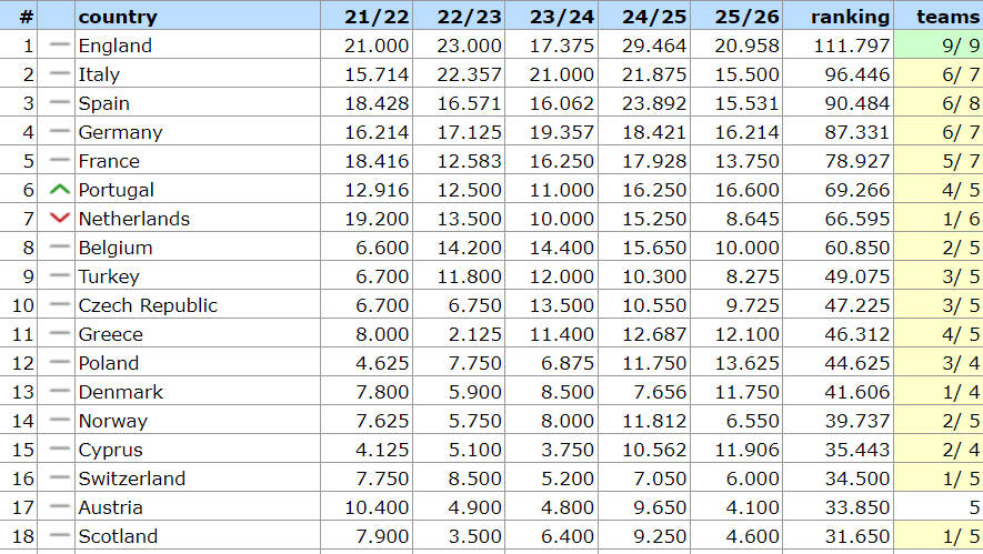 根据欧足联每五年更新一次的联赛积分排名规则,排名前四的顶级联赛能够获得四个欧冠的直通名额。一旦西甲跌至第五名,其直接参赛席位将被削减。这一危险已非常接近现实——目前西甲仅领先意甲0.31积分,差距微乎其微。