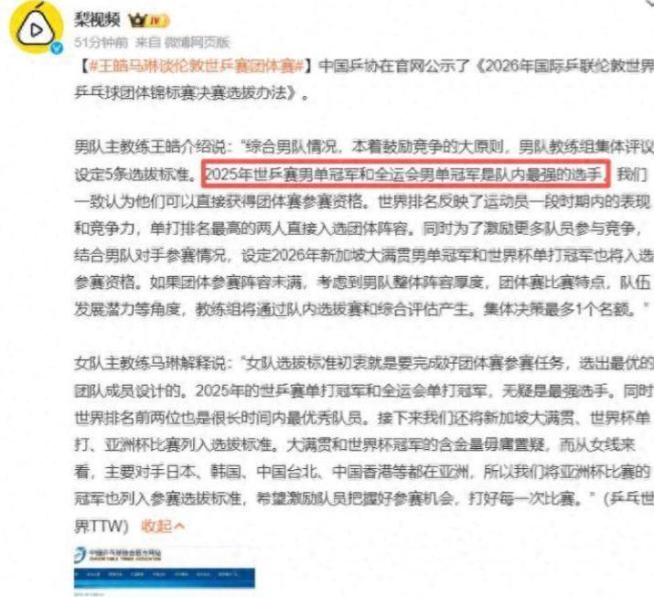 王皓对樊振东称呼的转变,背后是国乒战略布局的深刻调整。 从“小胖”到“队内最强选手”,标志着樊振东正式从被保护对象转变为团队核心领袖。 2026年2月3日,中国乒乓球队公布伦敦世乒赛男队选拔办法,樊振东凭借全运会男单冠军身份直接入围。 王皓在新闻发布会上明确表示:“综合男队情况,本着鼓励竞争的大原则,男队教练组集体评议设定五条选拔标准,2025年世乒赛男单冠军和全运会男单冠军是队内最强选手。 ”