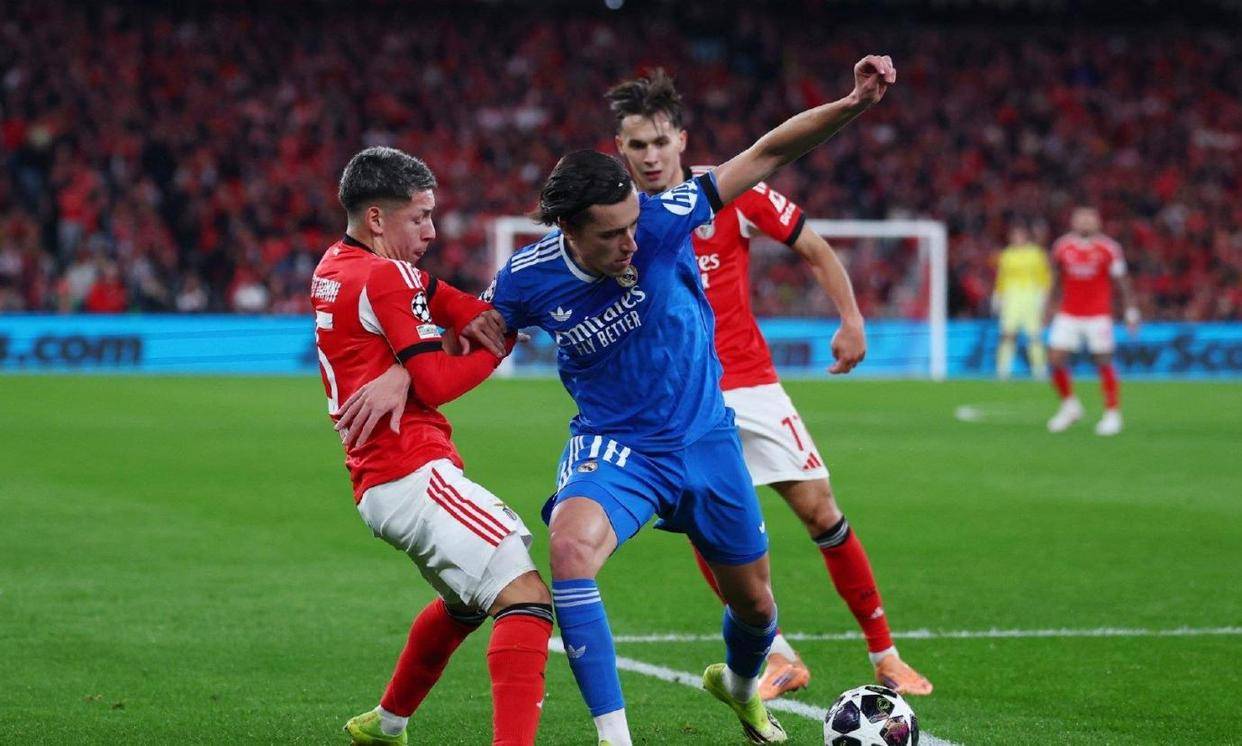 几乎在同一时间,另一场焦点战在葡萄牙里斯本的光明球场上演,由穆里尼奥执教的本菲卡迎战他的老东家皇家马德里。两队在一个月前的欧冠循环赛最后一轮刚刚交手,当时本菲卡在主场出人意料地以4比2击败了皇马,导致后者不得不参加残酷的附加赛,因此这场比赛对皇马而言是一场不折不扣的复仇之战。皇马此役排出了4-4-2阵型,库尔图瓦镇守球门,吕迪格和赫伊森组成中卫搭档,阿诺德和卡雷拉斯分居左右两边,中场由巴尔韦德、楚阿梅尼、卡马文加和居莱尔坐镇,锋线上则是姆巴佩与维尼修斯的组合。