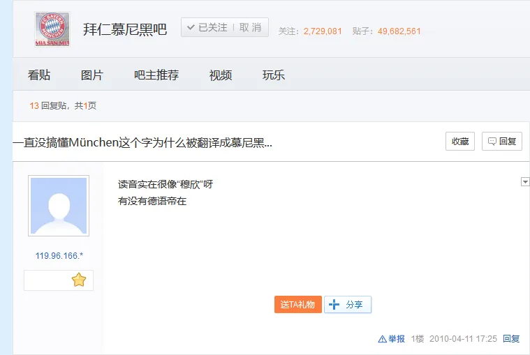 然后München是德语里“慕尼黑”的意思,球队官网上用的也是这个词。这个地名的中文翻译还是挺有意思的,因为从“慕尼黑”这个结果来看,它更像是从München的英语名称Munich音译得来的,但是“慕尼黑”里的“黑”似乎又显得“没有那么音译”的感觉,这个译名也让一些网友还有我产生了好奇。