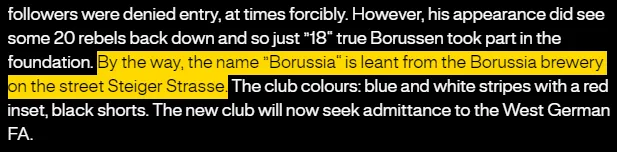 而关于他们什么时候把“多特蒙德”这一地名放进队名里,这个官方没有说明,但很可能在最开始时这些严谨的德国人为了方便区分就已经把球队称为了Borussia Dortmund。这里让我觉得最有趣的是,多特官网上在讲“Borussia”这个队名是怎么来的段落里,用的是“By the way(顺带一提)”作为开头,听起来像是取这个名字取得很随便的样子。