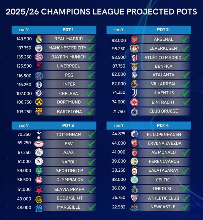 阿森纳位于第二档球队的首位,热刺暂时排在第三档的首位,不过如果本菲卡或者布鲁日无法通过附加赛,那么热刺可以上升到第二档。纽卡斯尔暂时是所有球队中排名最低的,只能锁定成为第四档中的一员,相信谁遇上纽卡,都是十分不乐意的。